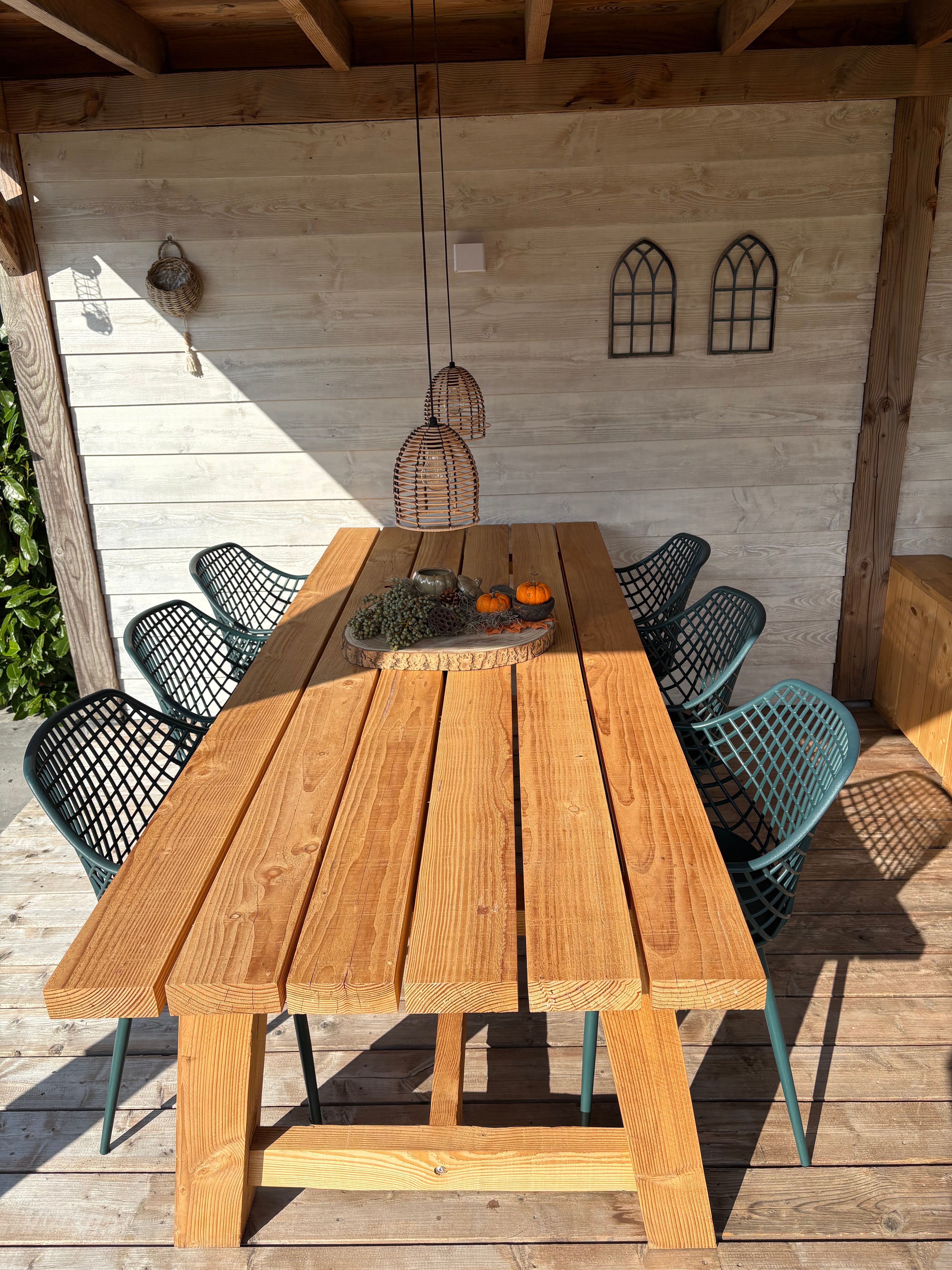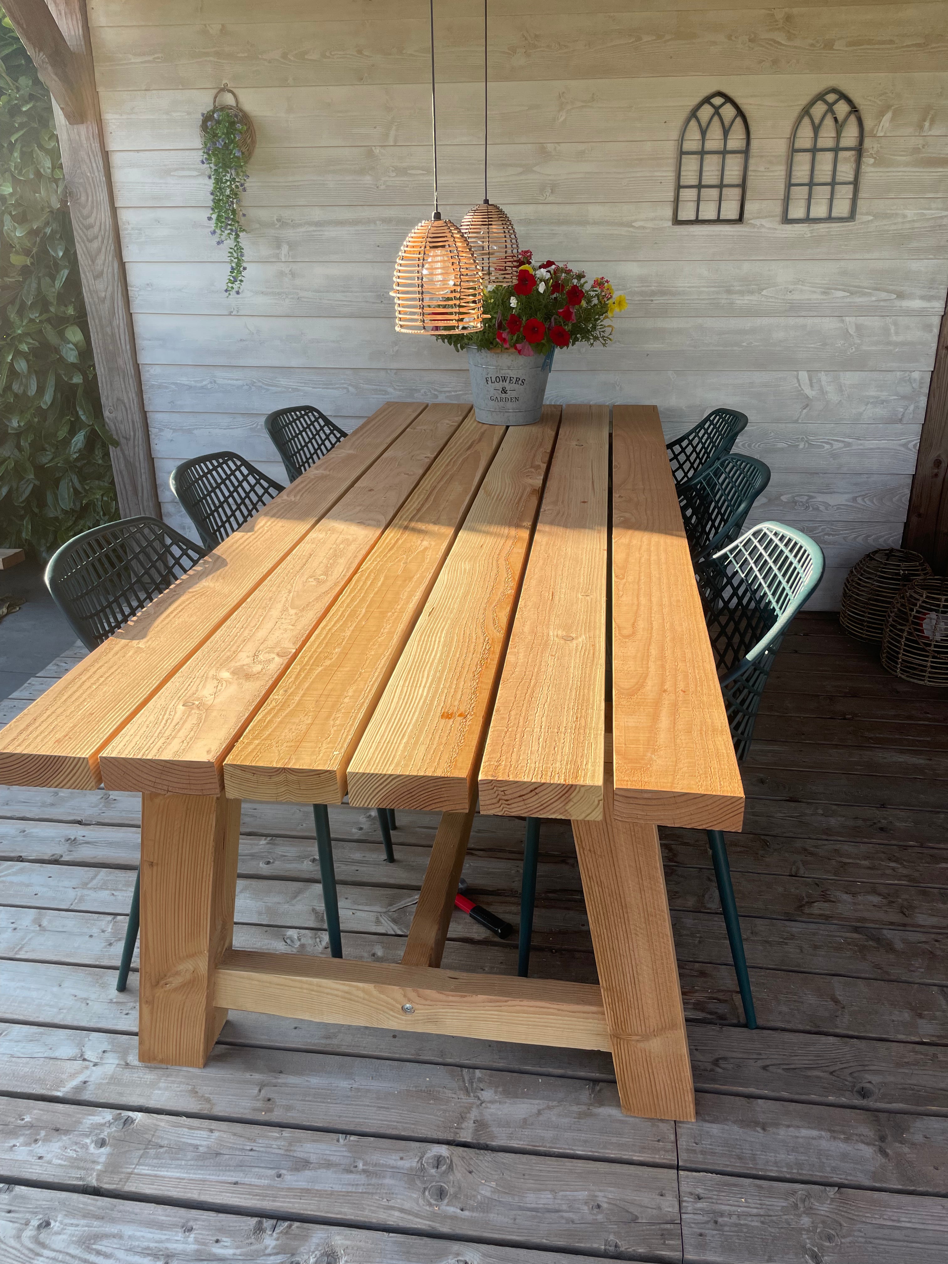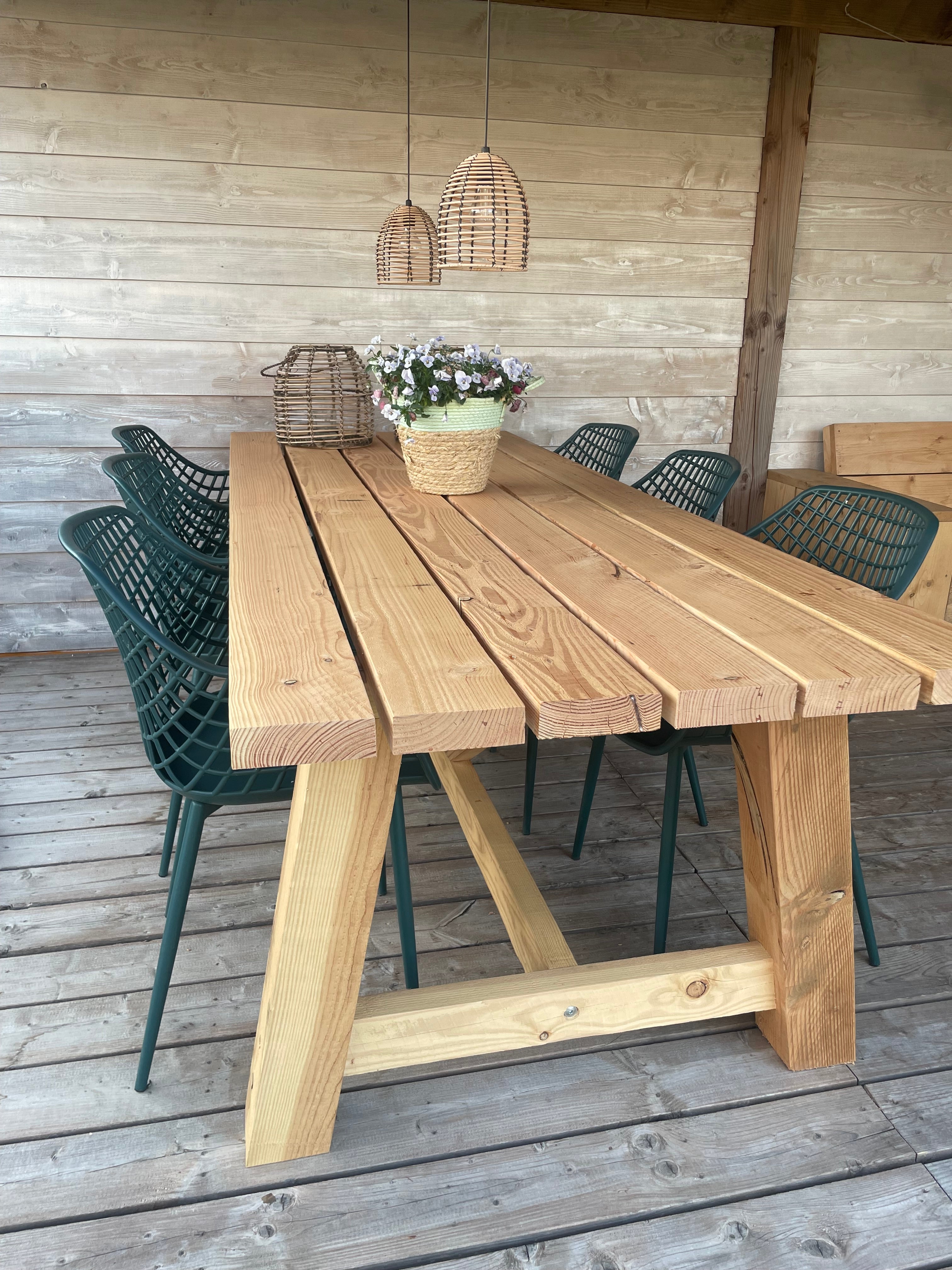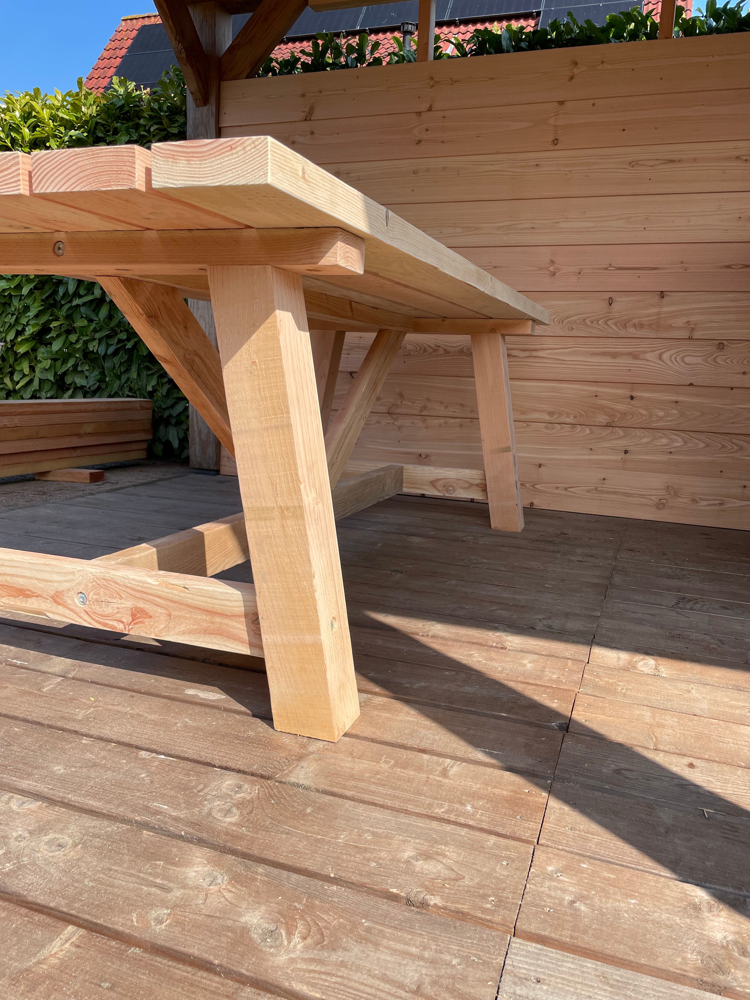 Onze douglas tuintafels worden handgemaakt en hebben een stoere, robuuste en natuurlijk uitstaling. Dankzij de sterke balken en de stevige constructie d.m.v. tellerkopschroeven is de tafel niet alleen een blikvanger maar ook zeer praktisch.