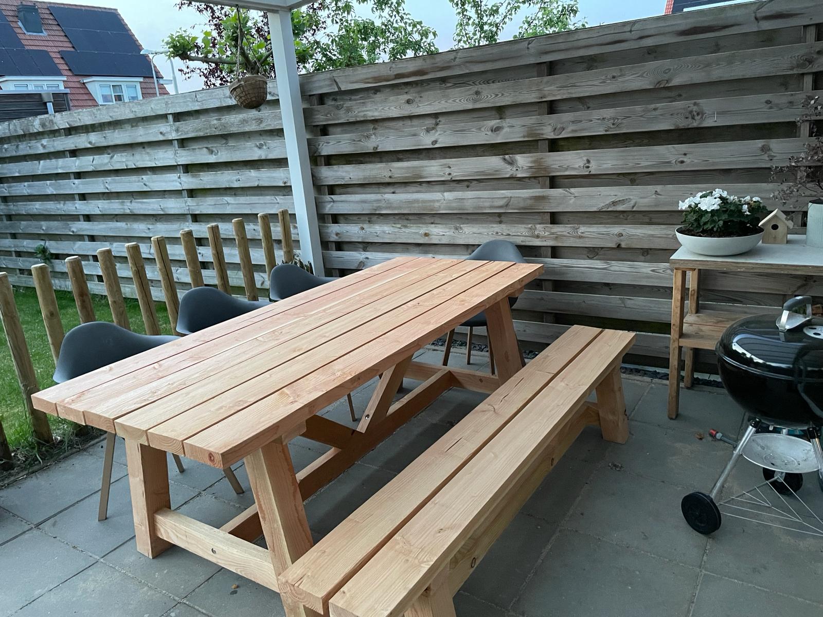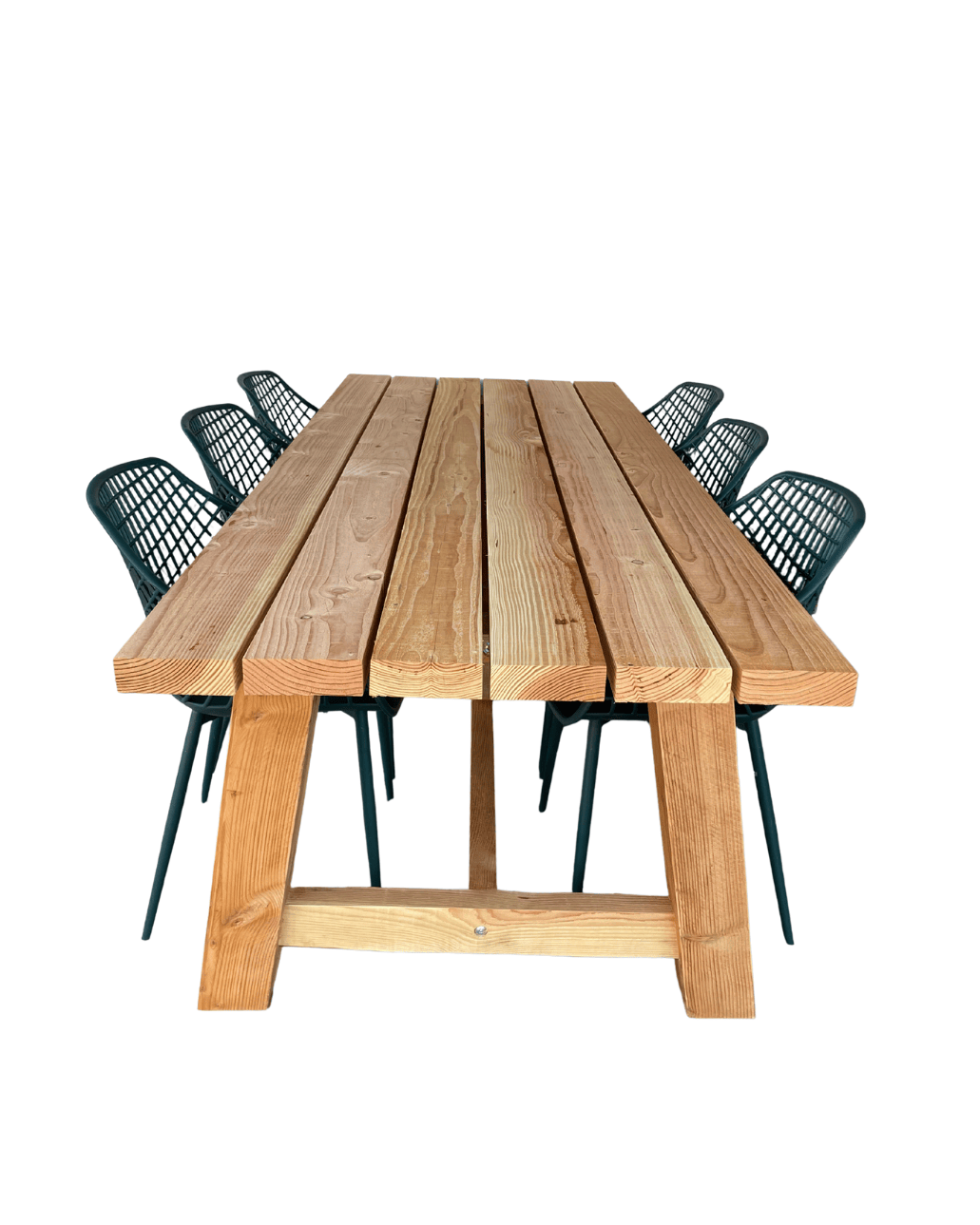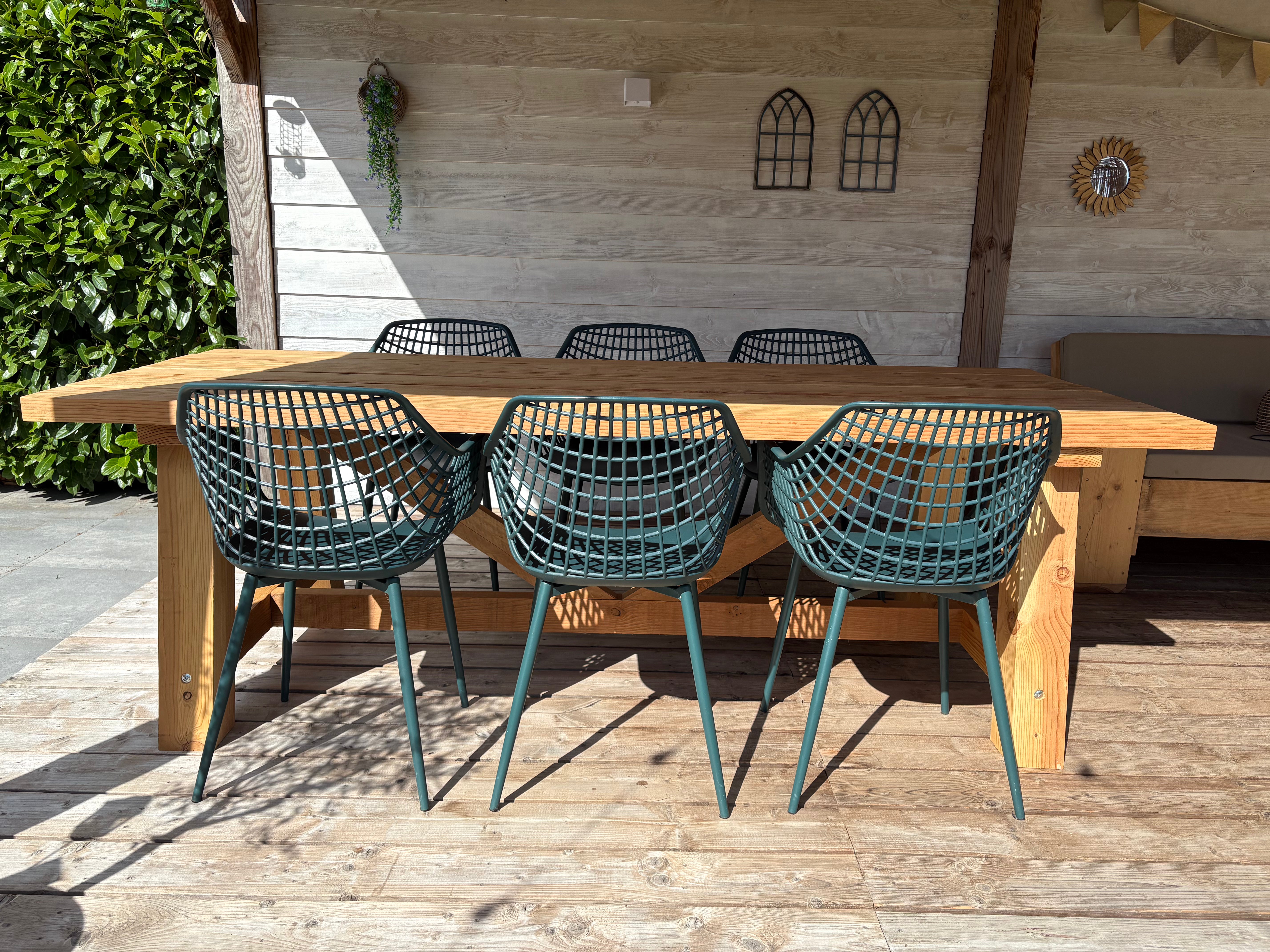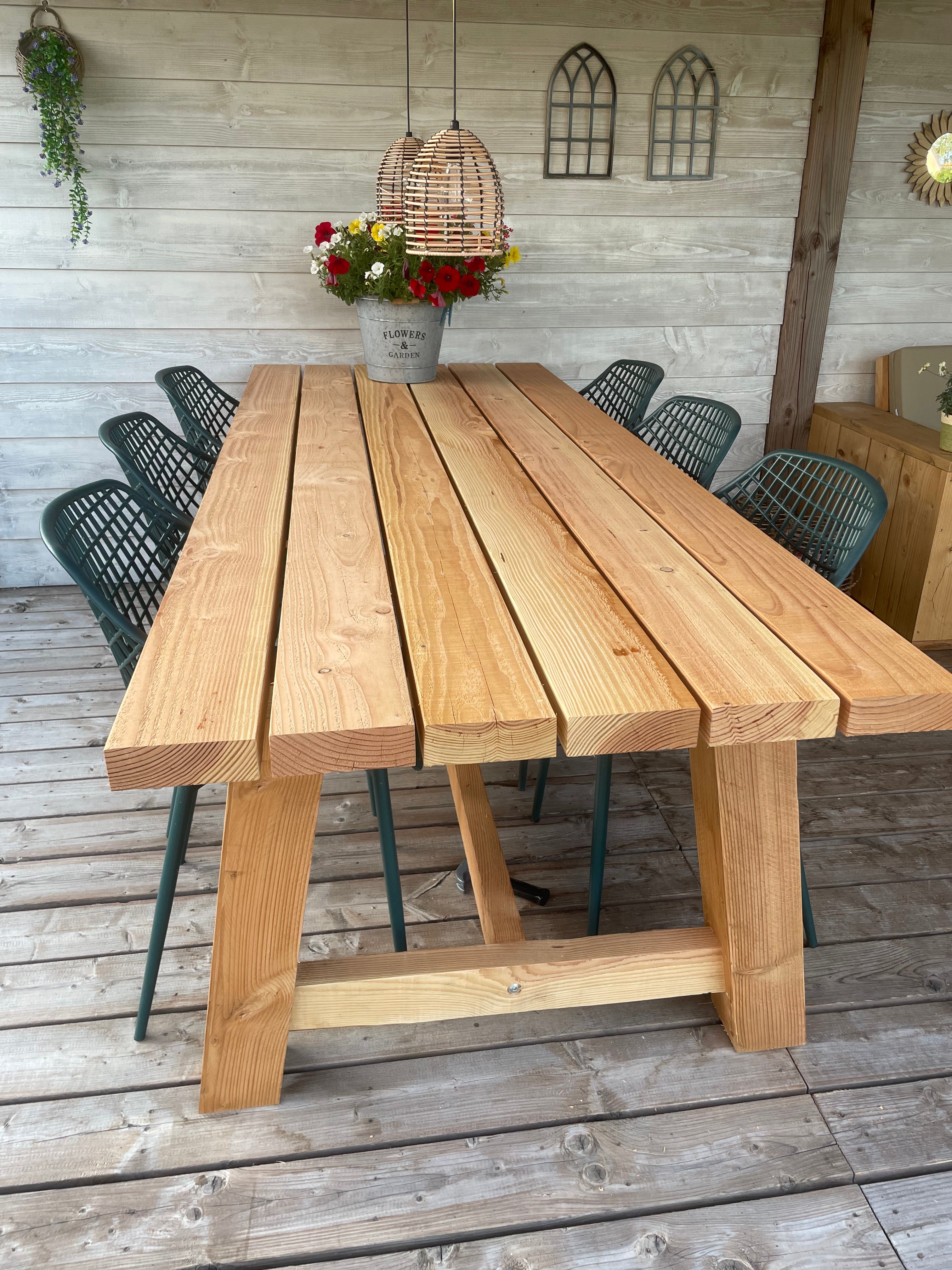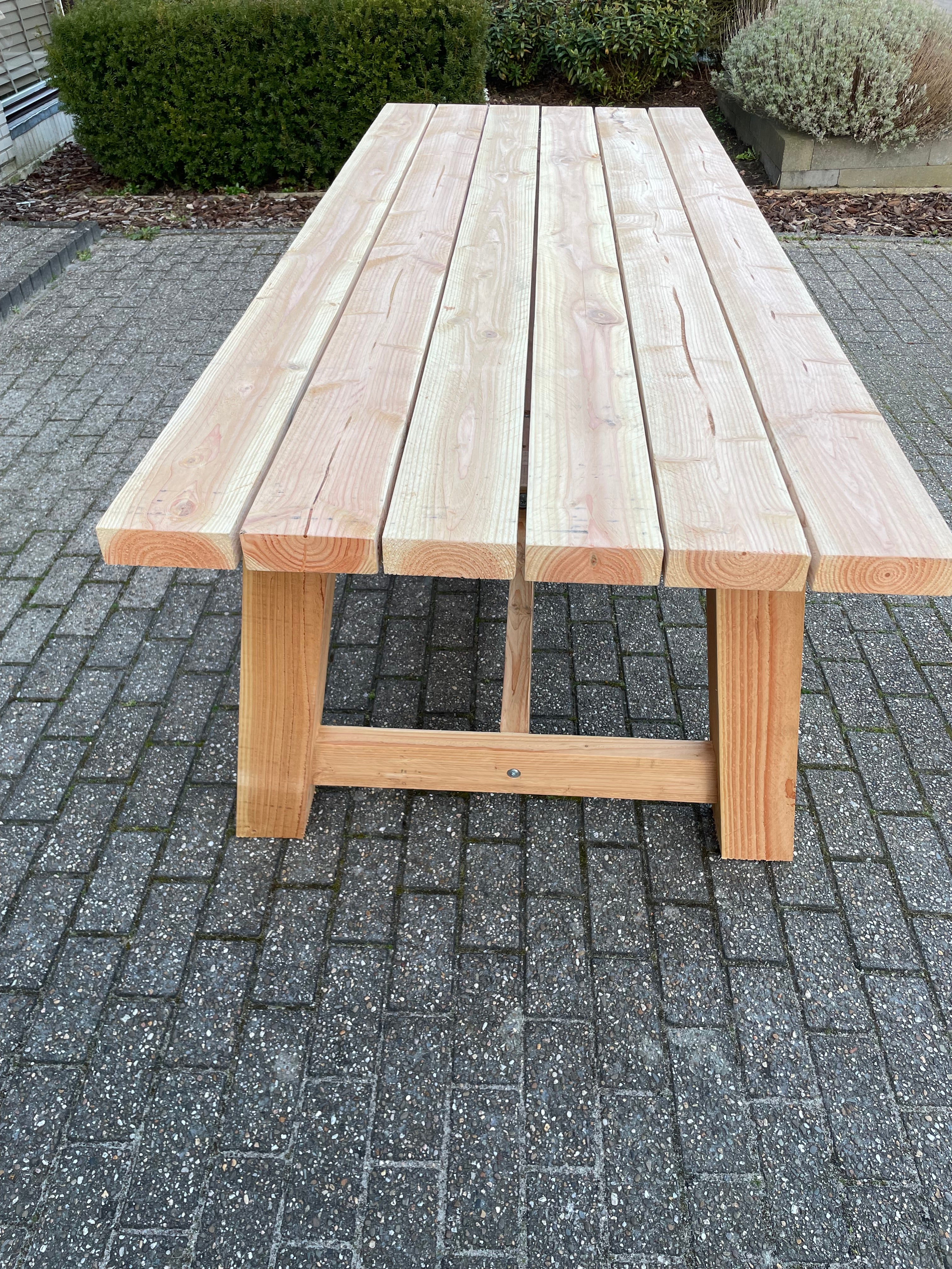 Onze douglas tuintafels worden handgemaakt en hebben een stoere, robuuste en natuurlijk uitstaling. Dankzij de sterke balken en de stevige constructie d.m.v. tellerkopschroeven is de tafel niet alleen een blikvanger maar ook zeer praktisch.