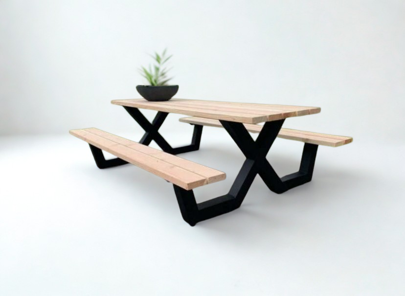 Picknicktafel met stalen X-poten voorzien van douglas balken.